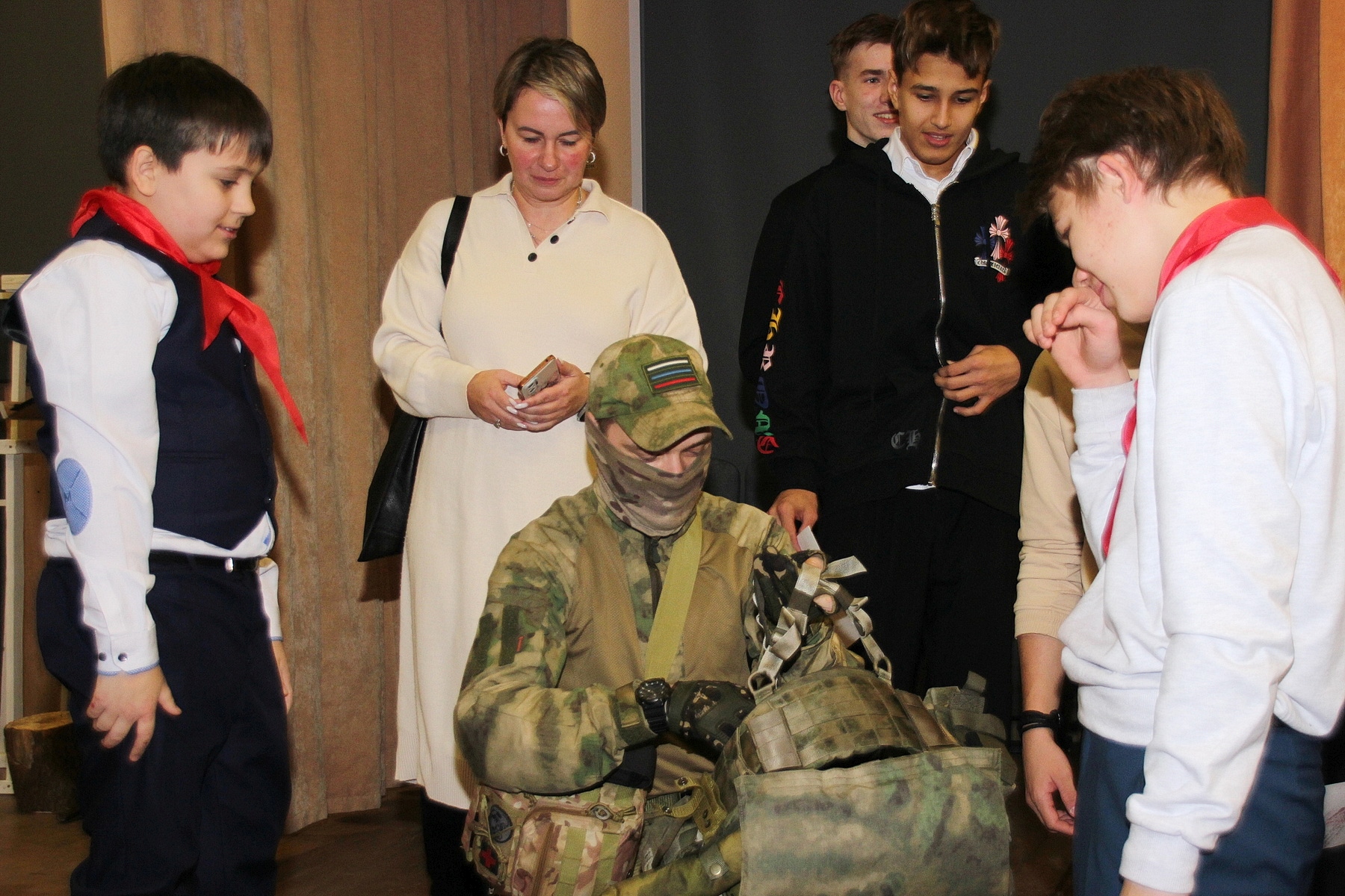 По сложившейся практике разговор начался с рассказа об учебе в школе и военных институтах (Сергей учился в Санкт-Петербурге, Данила – в Новосибирске). Затем участники встречи обсудили специфику службы в тылу и в зоне СВО, оснащения и обмундирования, коснулись вопросов психологической подготовки бойцов и выстраивания межличностных отношений. Говорили о страхе и способах его преодоления, о взаимовыручке и взаимопомощи. Особое оживление в зале вызвало предложение примерить «походную экипировку», которую Данила принес в школу. Самые сильные школьники надевали на себя 12-килограммовый бронежилет, а самые решительные натягивали противогаз.