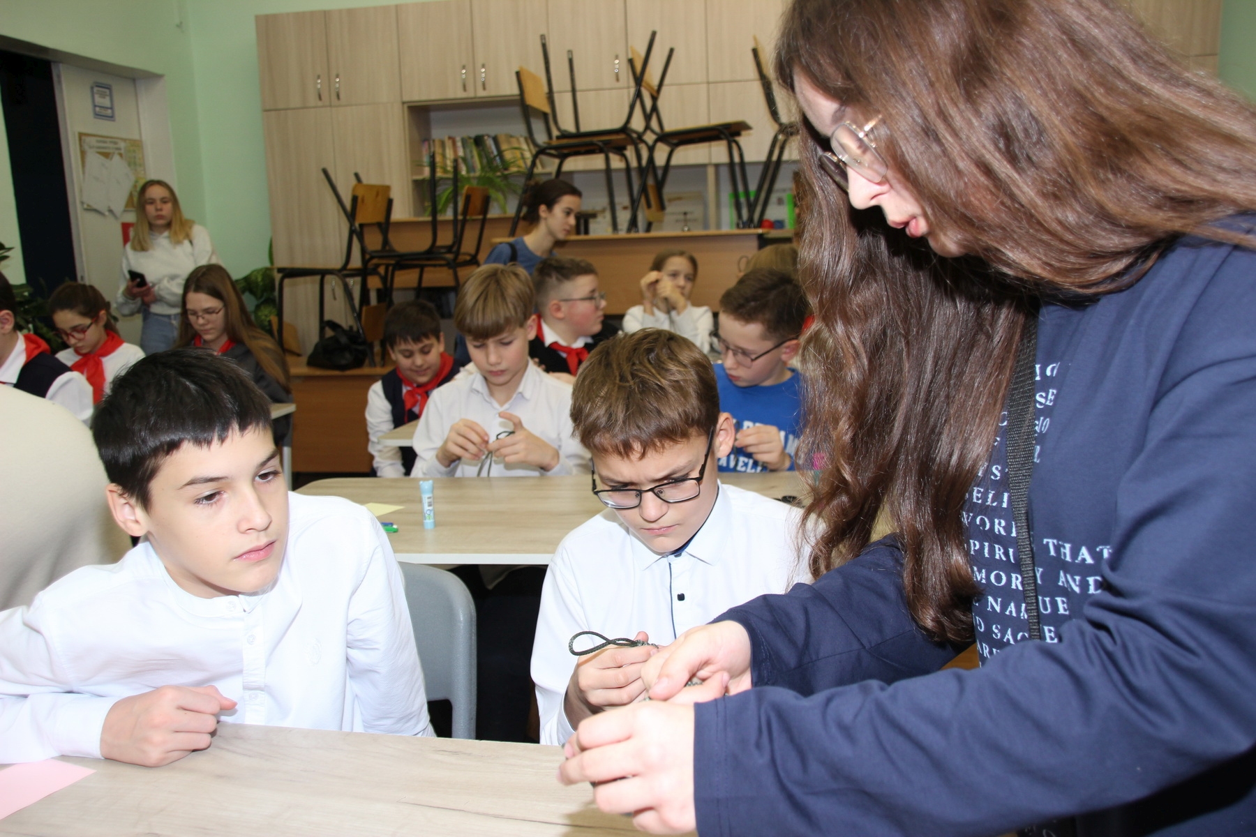 Декабрьская встреча с военнослужащими проводилась незадолго до Нового года, поэтому было решено совместить полезное с приятным: изготовить и подарить сувениры для бойцов и командиров. В одном классе ребята рисовали ангелов, в другом плели полезные подарки из специального жгута, который в случае необходимости может стать «веревкой-выручалкой». Также офицерам вручили открытки, заранее сделанные пионерами разных дружин.