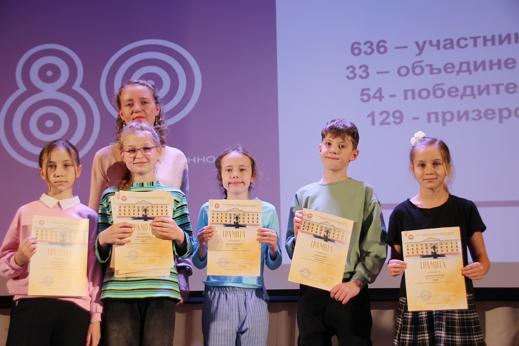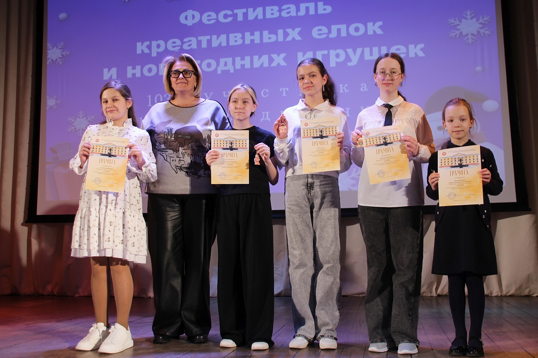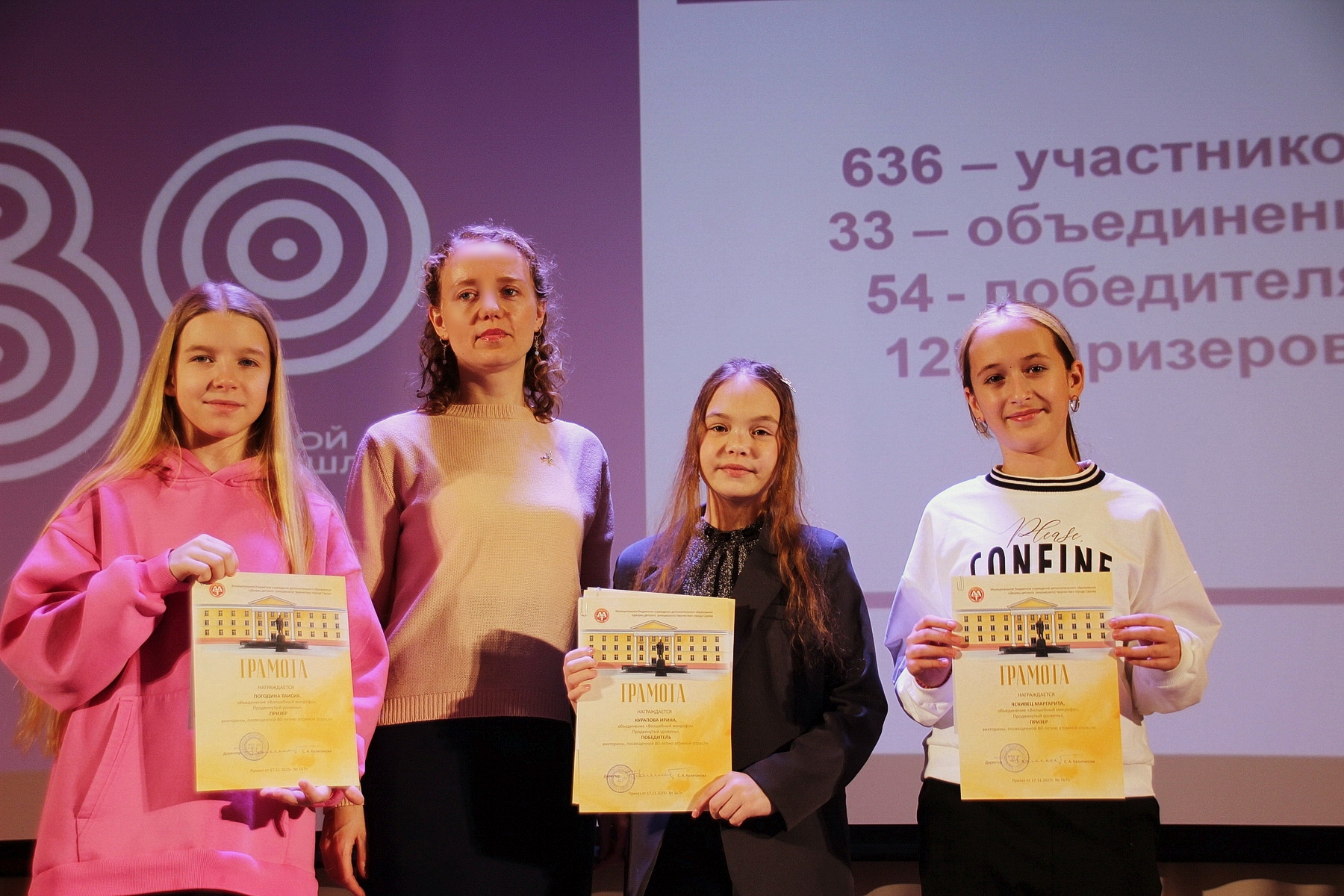 Торжественная церемония награждения победителей и призеров викторины, посвященной 80-летию атомной отрасли России, и участников фестиваля креативных елок и новогодних игрушек – приятное событие. Каждому приятно оказаться на сцене, получить диплом и памятный сувенир, услышать аплодисменты в свой адрес. 19 декабря директор Дворца детского творчества Светлана Калипанова и методист Ольга Потапкина, разработчик вопросов викторины, поздравили наиболее отличившихся.