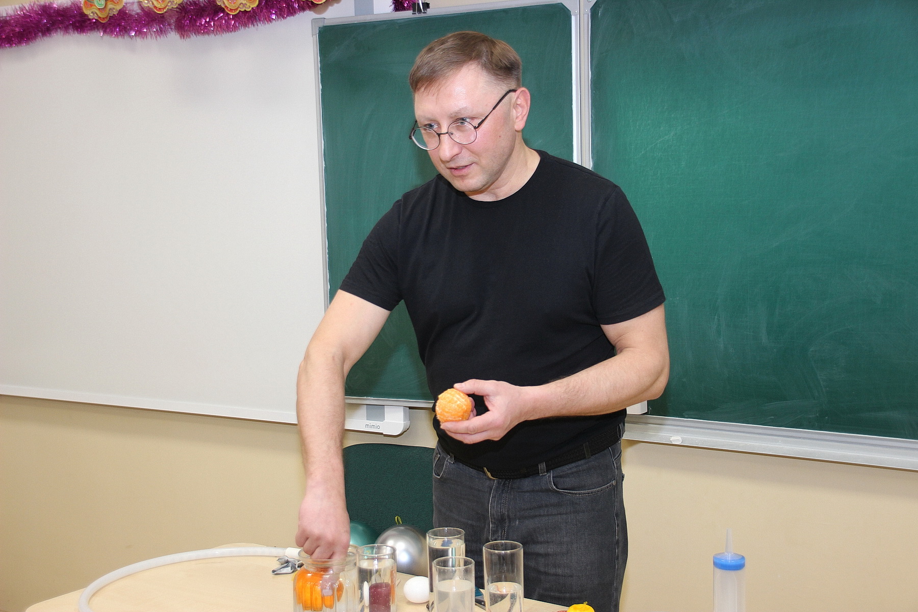Ведущими были Дед Мороз, Баба Яга, Кикимора и Просто Папа. Все они трудятся в Институте лазерно-физических исследований РФЯЦ-ВНИИЭФ, поэтому логично, что некоторые опыты демонстрировали оптические законы. Не оставили родители без внимания и другие разделы физики. Например, ребята искали объяснение, почему мандарин в кожуре плавает, а очищенный тонет; за счет чего держатся сцепленные зубчиками вилки; как бусы «перетекают» из стакана в стакан... «Высказывайте свои предположения! Мы же не ставим оценки», – призывали ведущие. А услышав верную версию, вручали поощрительные сладкие призы.
